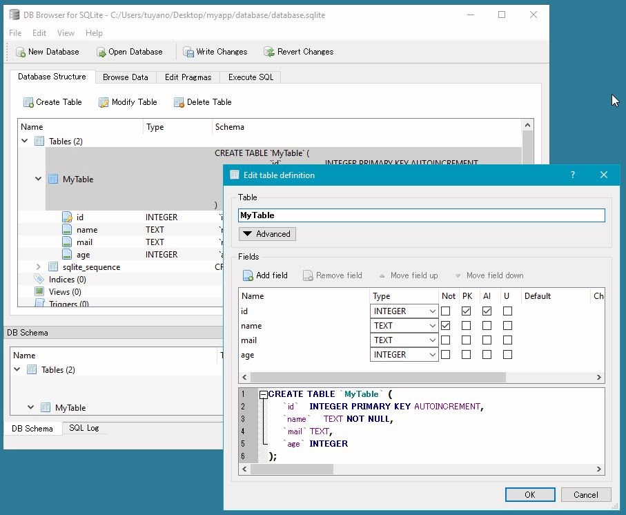 id――Type = INTEGER, 「PK」「AI」をONにする