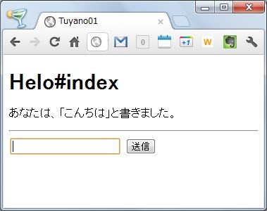 str2 = params['txt1']先ほど、パラメータの値を受け取ったのと全く同じです。フォームの送信も、paramsの中に整理されているのですね。ただし、今回はindexで普通にアクセスした時とフォーム送信をした時の両方の処理を行う必要がありますので、取得した変数str2がnilでなければ(つまり何かの値が送られてきたなら)変数@msgを設定するようにしてあります。
