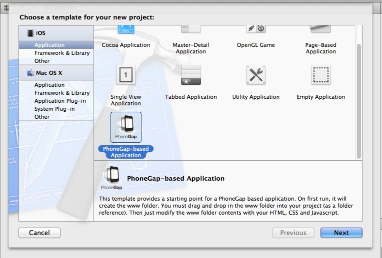 現れた「Choose a template for your new project」ダイアログの左側にある「iOS」という項目にある「Application」を選択すると、画面にさまざまなプロジェクトのアイコンが現れます。ここに「PhoneGap-based Application」というアイコンが追加されているはずです。これを選択して「Next」ボタンを押します。