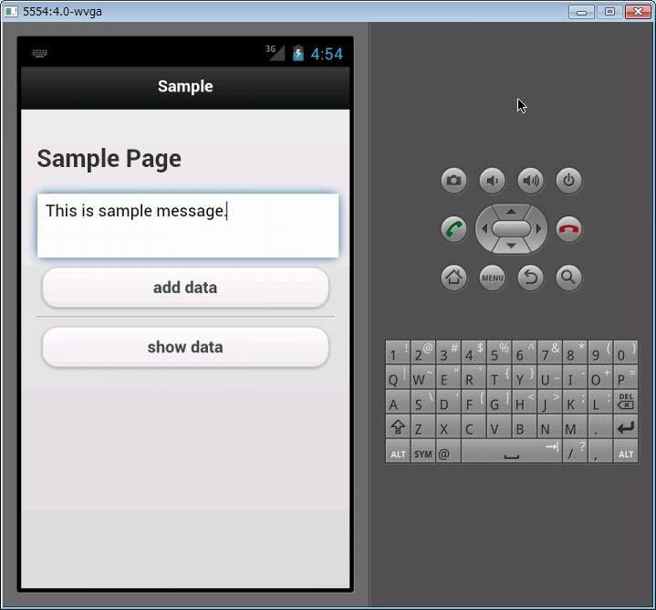 <uses-permissionこのサンプルは、1つの入力エリアと2つのボタンからなります。入力エリアにテキストを書いて「add data」ボタンをクリックすると、書いたテキストを保存します。保管されたテキストは、ゼロから順に番号をつけて管理されます。入力エリアに番号を書いて「show data」ボタンを押すと、その番号のテキストをダイアログで表示します。