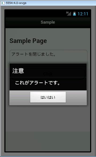 navigator.notification.alert("これがアラートです。",callbackAlert,"注意","はいはい");