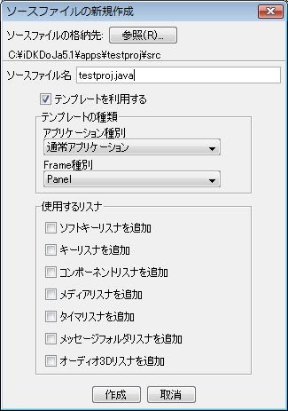 ただし、新規作成のダイアログで「引き続きソースファイルを作成する」というチェックがONになっていると、作成した後に、ソースファイルの設定ウインドウが現れます。これは、以下のような項目が表示されます。