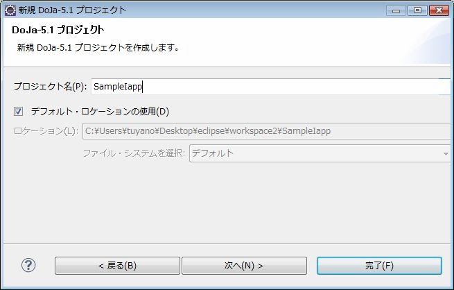 では、Eclipseでプロジェクトを作成する場合はどうするのでしょうか。これは、<ファイル><新規><プロジェクト>メニューを選び、現れたウィザード選択ウインドウで「Java」内の「DoJa-5.xプロジェクト」を選んで次へ進みます。
