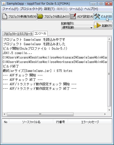 こうして、iappliToolで「ビルド」ボタンを押して、プロジェクトをビルドします。特にエラーなどもなく、プログラムをきちんと生成できたなら、「コンソール」タブの表示エリアに「ビルド終了 最終Jaraサイズ[SampleIapp.jar] : 675 bytes」というような表示が出力されます。