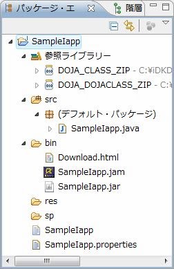 「bin」フォルダ――生成されたプログラムに関するファイルが置かれます。デフォルトでは「SampleIapp.jam」というファイル(ADFと呼ばれるもの)が自動生成されています。ビルド後は、それに加え、「Download.html」「SampleIapp.jar」といったファイルが自動生成されます。