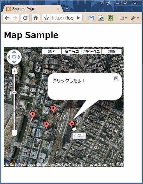 google.maps.event.addListener( オブジェクト , "イベント名" , 呼び出す関数 );ここでは、Mapにclickイベントを設定しています。同様にして、マーカーにイベントを設定させることも可能です。また呼び出す関数では、引数が1つ渡されます。これにより、発生したイベントの情報を得ることができまうs。