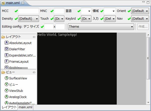 では、レイアウトを作成するXMLファイルから見ていきましょう。既に作成されている「main.xml」を開いてみてください。かなり予想外の表示が現れるはずです。