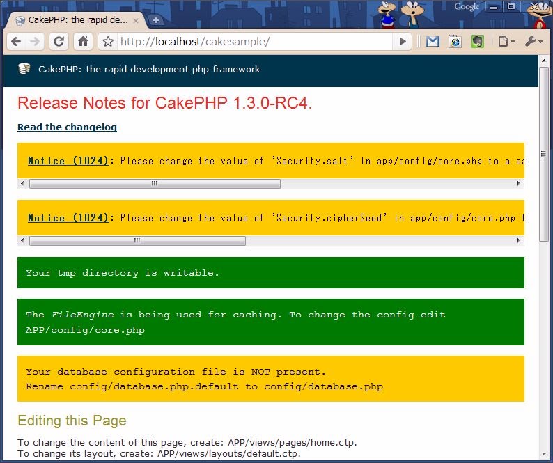 http://localhost/cakesample/これで、CakePHPフレームワークのトップページが現れます。ここに、なにやらメッセージがいくつも表示されているはずです。このトップページは、現在のCakePHPの動作状況に関する情報を表示するようになっています。これで、現在、何か問題があるのかが一目でわかるようになっているわけです。