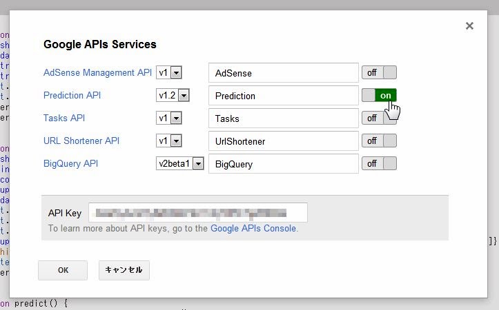 変数 = Prediction.newTraining();引数も何もありませんから簡単ですね。作成されたTrainingオブジェクトは、文字通りトレーニングを管理するものです。これに、先ほどGoogle Cloud Storageにアップロードした予測データを設定します。