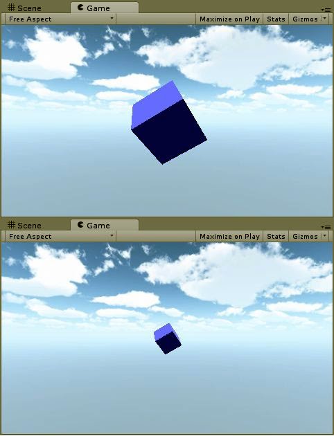 Updateメソッドを書き換えてください。シーンを実行すると、Z軸方向にゆっくりとCubeが遠ざかっていきます。ここでは