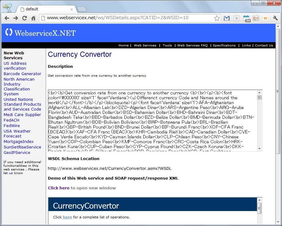 CurrencyConvertorは、貨幣単位の変換レートを調べるものです。例えばドル=円の換算レートなら、「78.15」というような値が返されます(つまり、1ドル=78.15円、という意味です)。