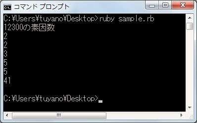 a = 12300 x = a y = 2 puts(a.to_s + "の素因数") while true if x % y == 0 then x /= y puts(y) else y += 1 end if x / 2 < y then break end end if x > 1 then puts(x) end
