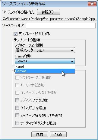 Eclipseプラグインを遣って作成する場合は、Eclipseの<プロジェクト>メニューに追加された<DoJa-5.x>メニューから<ソースファイルの新規作成>を選び、現れたダイアログで「Frame種別」を「キャンバス」に変更して作成をします。