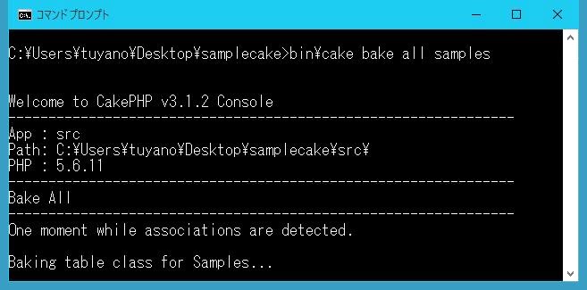 Welcome to CakePHP v3.1.2 Console --------------------------------------------------------------- App : src Path: C:\……パス……\samplecake\src\ PHP : 5.バージョン --------------------------------------------------------------- Bake All --------------------------------------------------------------- Possible model names based on your database: - members - messages - mydatas - persons Run `cake bake all [name]` to generate skeleton files.