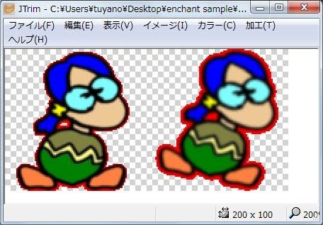 では、実際にやってみましょう。前回、100×100ドットの大きさでキャラクタのイメージを作りましたね。このキャラクタを少し変化させたイメージをもう1つ作成し、この2つを横に並べて200×100ドットのイメージファイルを1つ作成してください。ファイル名は、「character2.png」としておきましょう。前回同様、キャラクタの周辺部分は透過設定しておきます。作成したファイルは、HTMLファイルと同じ場所に配置しておきましょう。